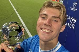 体育资讯10月02日讯 那不勒斯本轮欧冠2-1葡体,霍伊伦双响,赛后被评为全场最佳!赛后,欧冠官方晒出了霍伊伦和MVP奖杯的自拍。